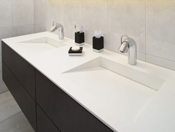 Aus diesen Tafeln und Einzelbecken stellen wir, sowie weitere spezialisierte Verarbeiter massvariable, individuelle Einzel- und Mehrfachwaschtische und Küchenabdeckungen her. Zu jeder Farbe ist passender Fugenklebstoff erhältlich. Damit lassen sich praktisch endlose Anlagen mit unsichtbaren Verbindungen herstellen.